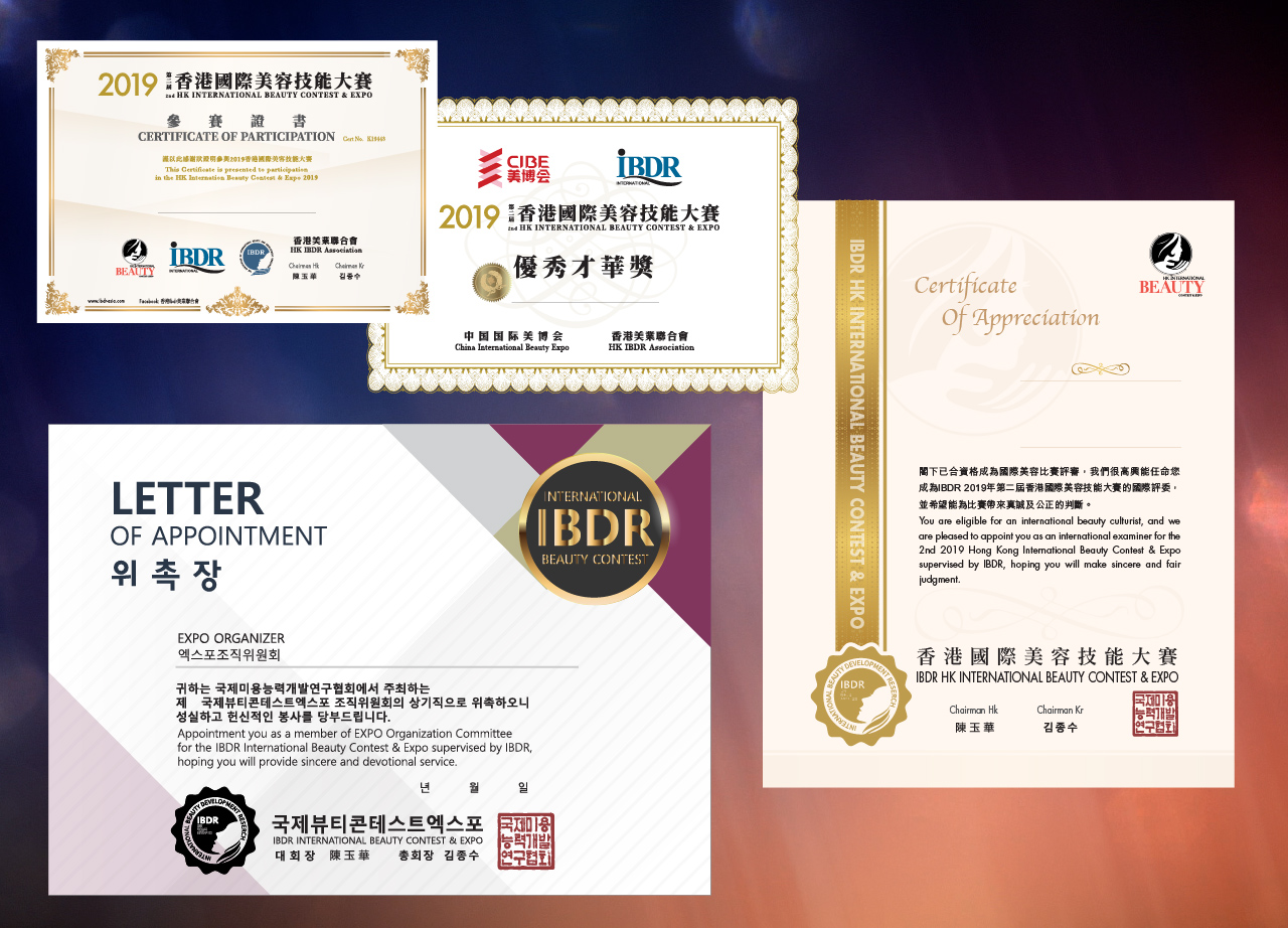IBDR香港國際美容技能大賽 比賽由IBDR美業協會全力主辦,歷屆口碑滿載, 享譽國際,成功獲得多個地區的美業專才參與盛事,其中參賽者來自韓國、中國、香港、馬來西亞、 澳門、台灣、日本、澳洲、美國及加拿大等多個地區,受到亞洲多個地區注目。比賽項目包括半永久化 妝、睫角蛋白翹睫毛、美甲、化妝、皮膚護理、髮型、人體彩繪等,各項目均設有金銀銅大獎及全場大 獎。比賽能見證各參賽者,代表自己國家地區參賽,並贏取榮耀,在業界發光發亮,絕對是不可錯過的美容界盛事。 Change by your hands , Chance in your hands 榮譽獎項 設多項比賽項目,贏取各項獎盃,更設有各項目總冠軍及全場大獎等 獲頒證書 除頒發香港IBDR國際證書外,亦獲韓國受權頒發的IBDR韓國證書 國際盛事 參賽者及支持機構,已超過十二個地區及國家一同擁踴參與